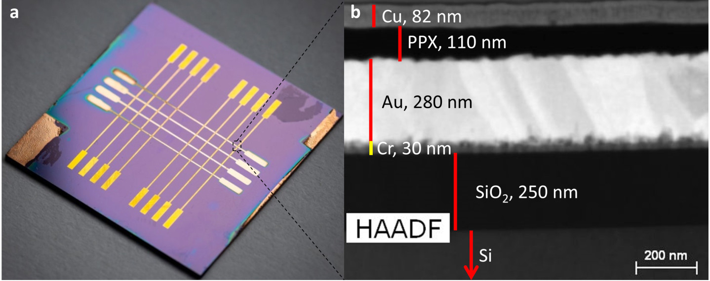 Кроссбар-массив органических мемристоров, используемый для эмуляции синапсов в нейроморфных вычислительных системах.