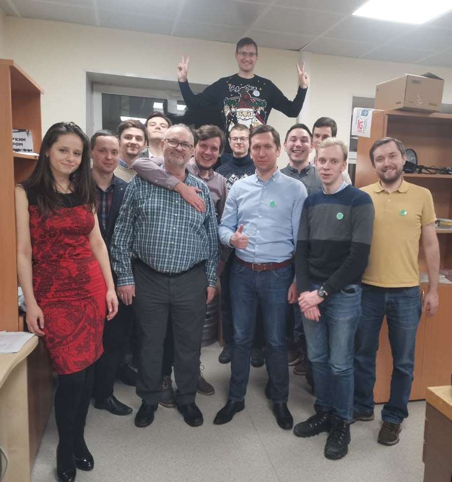 На фото: Руководитель лаборатории к.ф.-м.н. Демин В.А., в.н.с. д.ф.-м.н. Рыльков В.В., н.с. Емельянов А.В., Миннеханов А.А., Николаев С.Н., а также студенты и аспиранты.