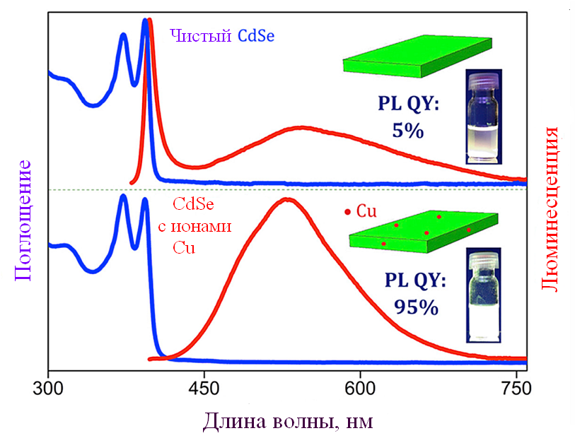 Слева спектры поглощения (синие) и флуоресценции (красные) исследованных в нашей лаборатории квази-двумерных нанопластинок CdSe в растворе: без добавки ионов меди (вверху) и после модификации ионами меди (внизу). Врезки – фотографии пробирок с люминесцирующими растворами. Справа спектры люминесценции и фотографии лабораторных моделей светодиодов, полученных комбинированием полупроводникового ультрафиолетового светодиода с люминофором в полимерной матрице до модификации люминофора медью (сверху) и после модификации (внизу).