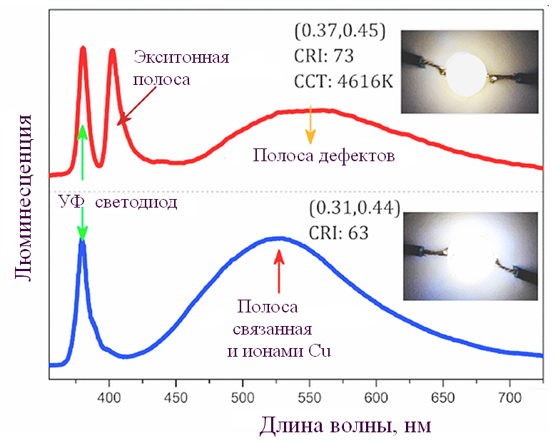 Известно, что у наночастиц помимо узкой спектральной полосы экситонной люминесценции, соответствующей размеру частиц, имеется ещё и излучение в очень широком спектральном диапазоне, которое связывают со «свечением» дефектов кристаллической решётки на поверхности наночастиц. Обычно стараются избавиться от такого «свечения» дефектов, которое отбирает энергию у узкой экситонной полосы люминесценции. Для люминофоров, с которыми мы работали, было предложено наоборот усилить широкую «дефектную» полосу в спектре люминесценции наночастиц, подавив свечение в экситонной полосе с тем, чтобы получить из однотипных наночастиц одинакового размера люминофор, сразу дающий белое свечение. За счет легирования ультратонких (толщина 2–3 нм) нанопластинок селенида кадмия (CdSe) ионами меди удалось решить эту задачу и получить белый люминофор с квантовым выходом фотолюминесценции, достигающим 95%. Объединив такие нанопластинки в полимерной матрице с чипом-излучателем ультрафиолетового света изготовили прототип светоизлучающего устройства (LED) белого света.