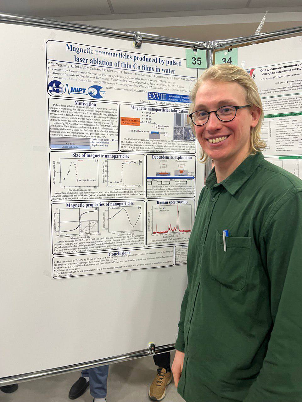 - 14 марта 2024 аспирантом В.Ю. Нестеровым был сделан доклад на тему "Магнитные наночастицы, изготовленные методом импульсной лазерной абляции тонких пленок кобальта в воде" на международном симпозиуме "Нанофизика и наноэлектроника" в Нижнем Новгороде. Стендовый доклад, представленный в секции по магнитным наноструктурам, вызвал интерес у участников симпозиума и продуктивное обсуждение полученных результатов более с чем 10 коллегами в течение 1,5 часов.